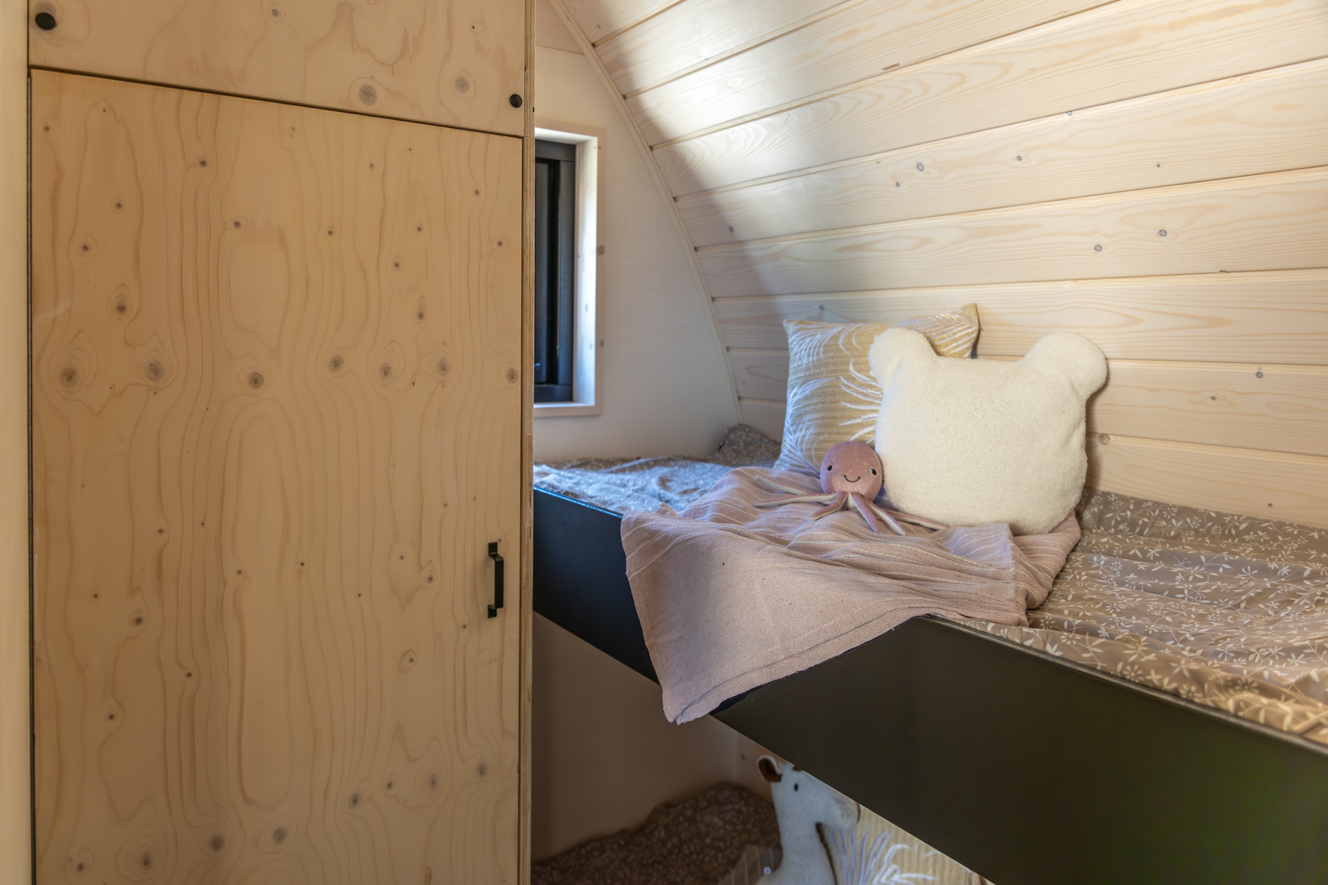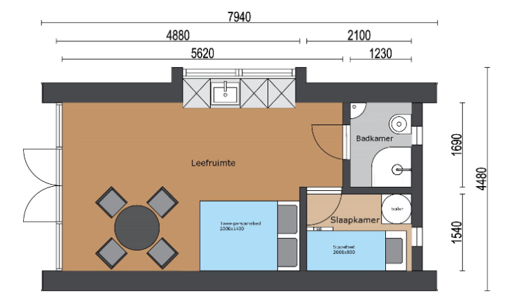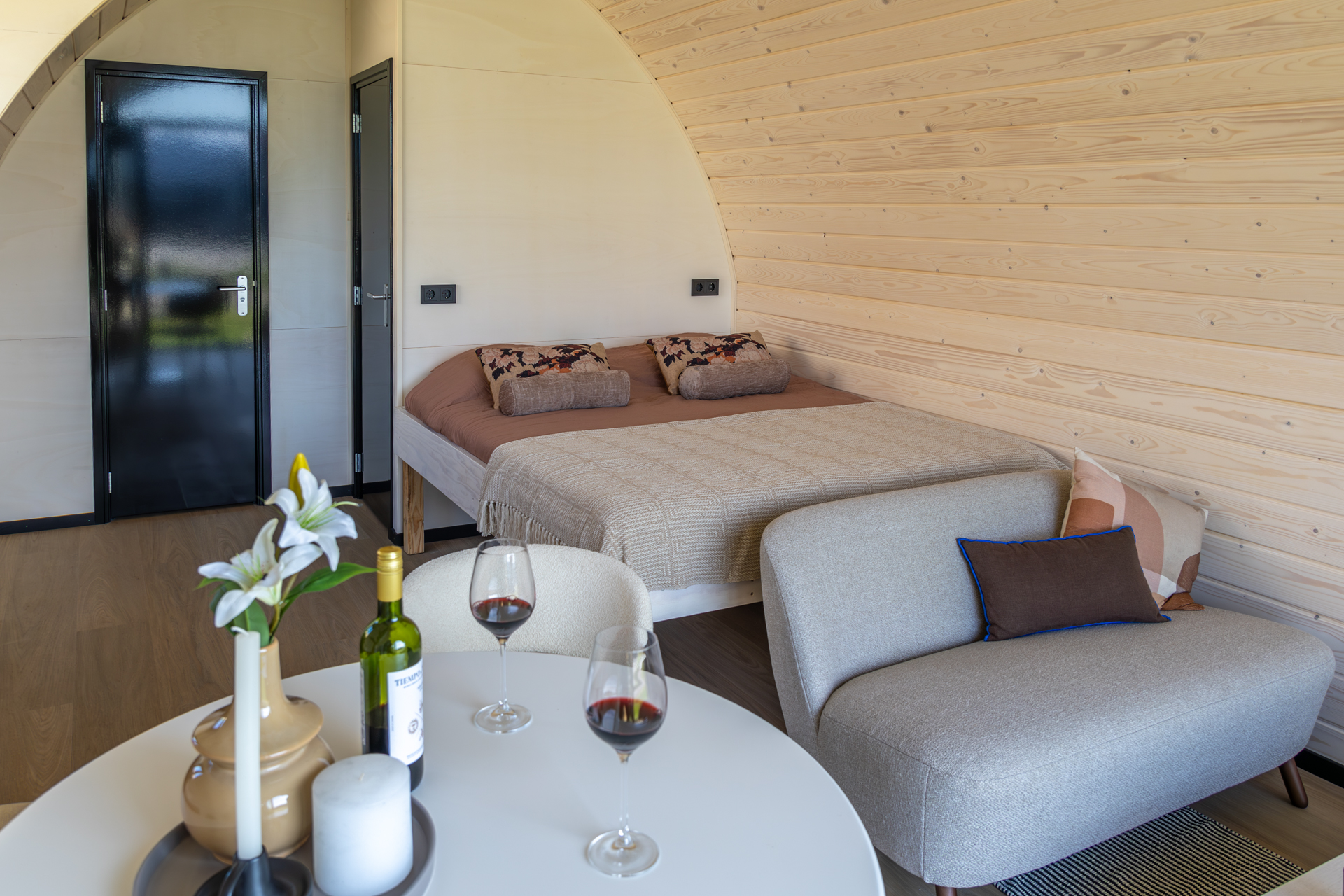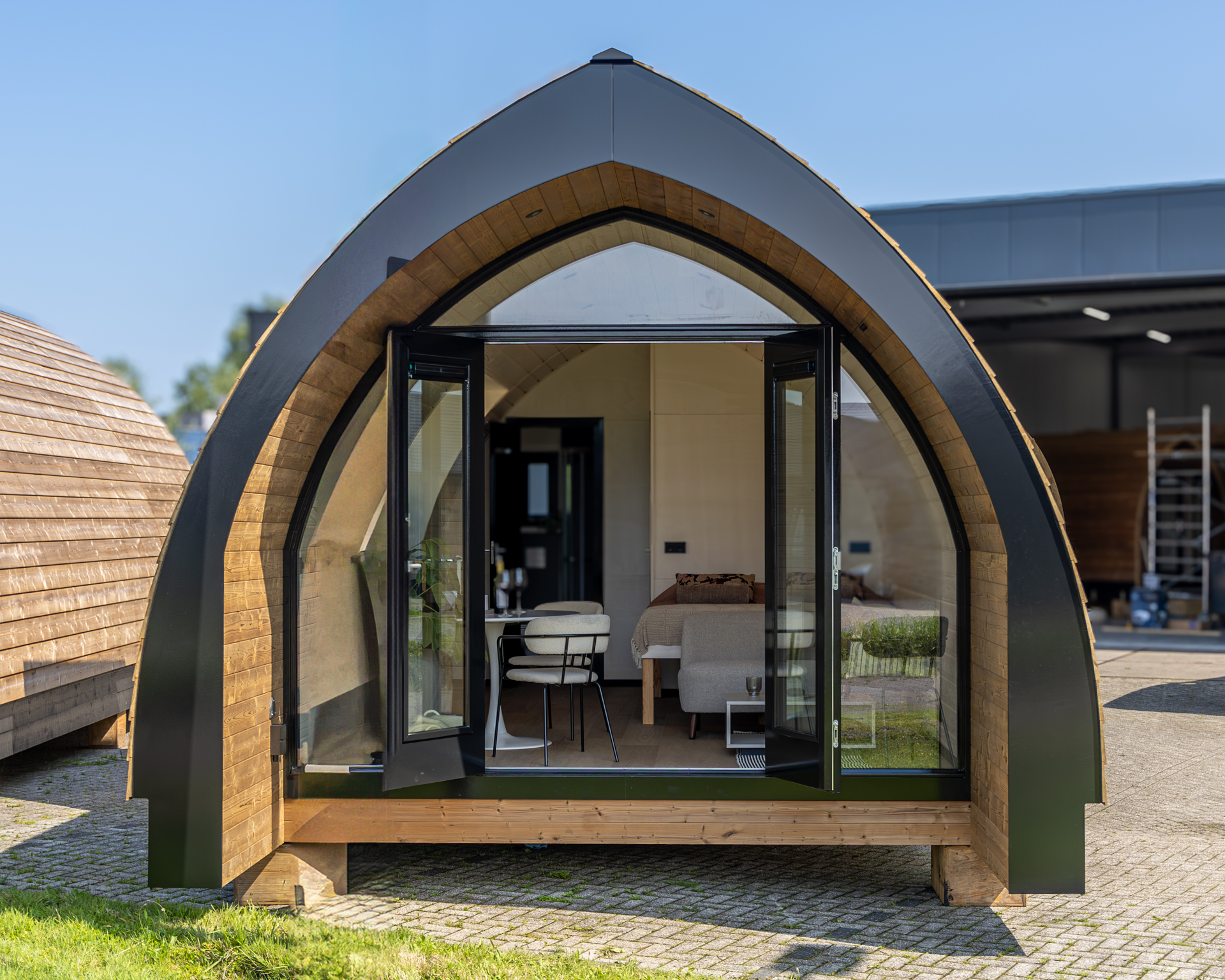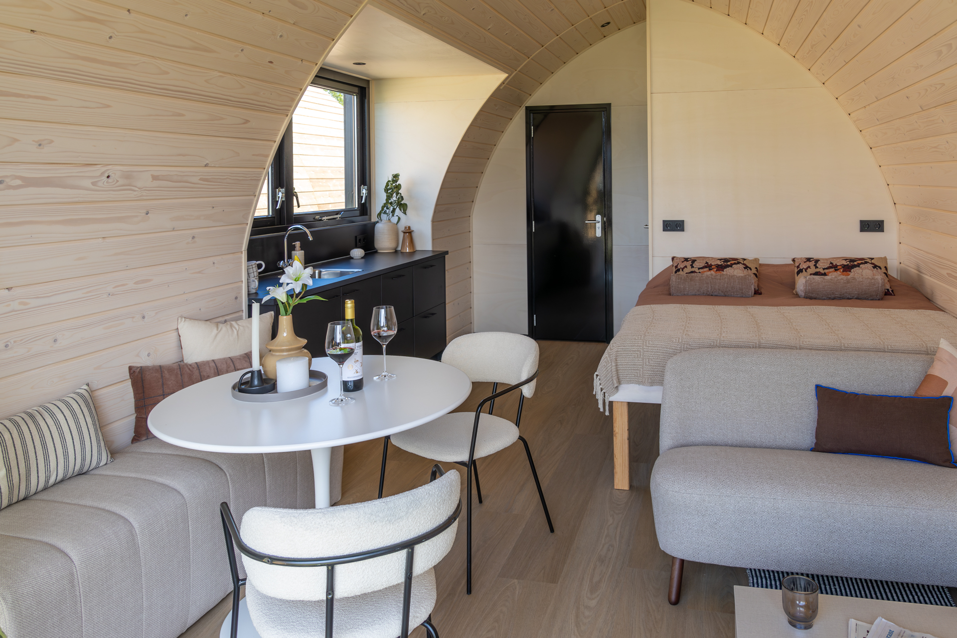 Deze Pod kan ook worden uitgevoerd als tweepersoonsvariant met het bed in een aparte slaapkamer voor extra comfort en privacy.