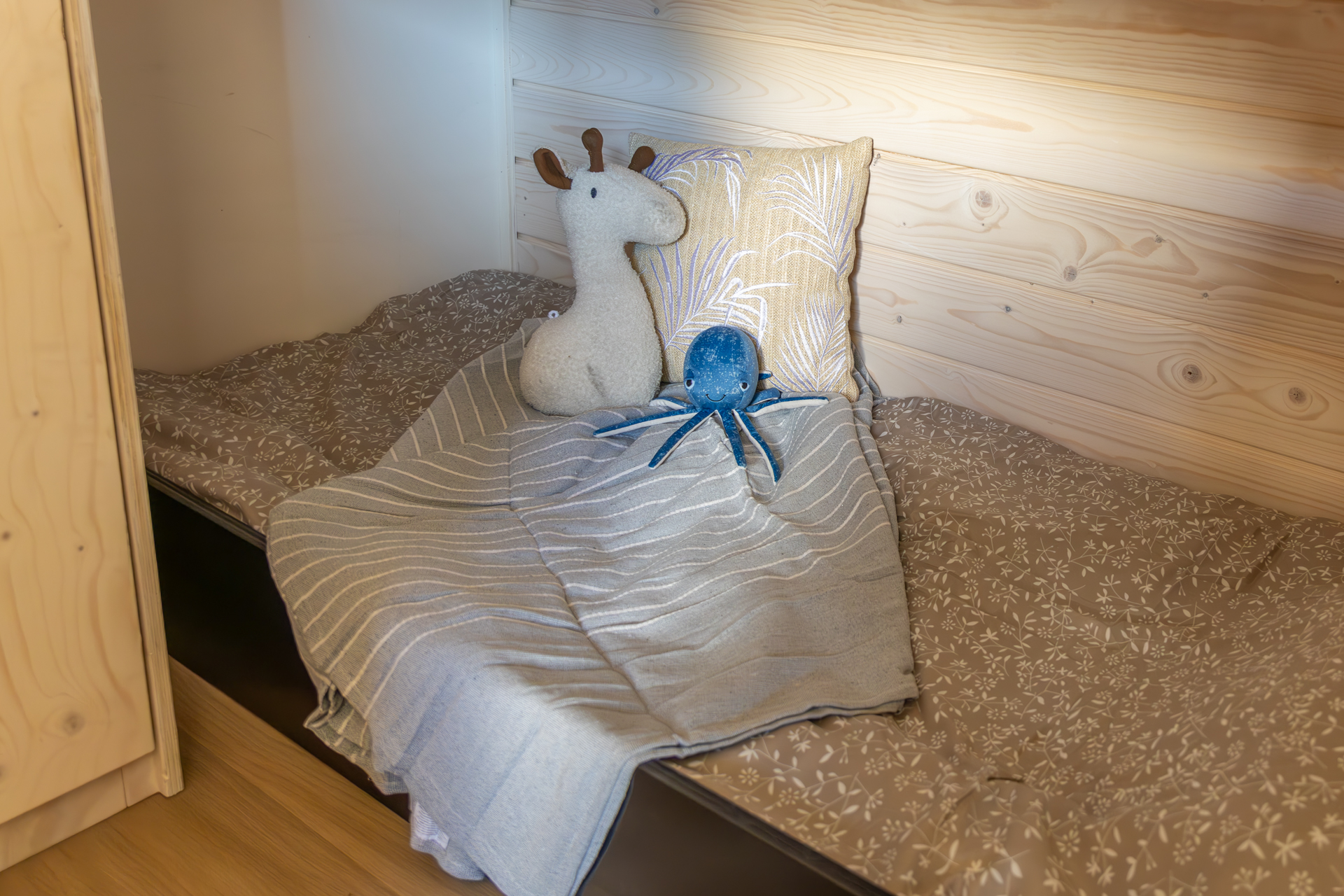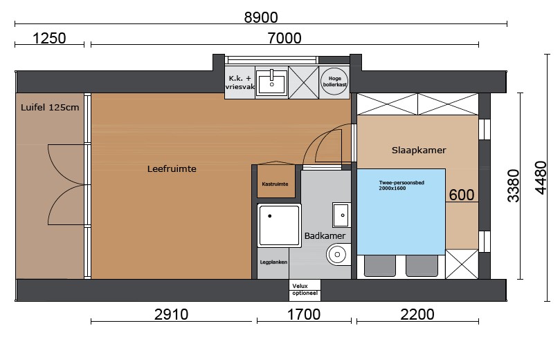 Binnen biedt dit model verrassend veel ruimte. Een leefgedeelte, de badkamer en een slaapkamer met stapelbed. In de leefruimte bevindt zich een ruime keuken in het dakkapel en is ruimte voor een tweepersoonsbed en zithoek. Kortom ideaal voor gezinnen of gasten met kinderen.