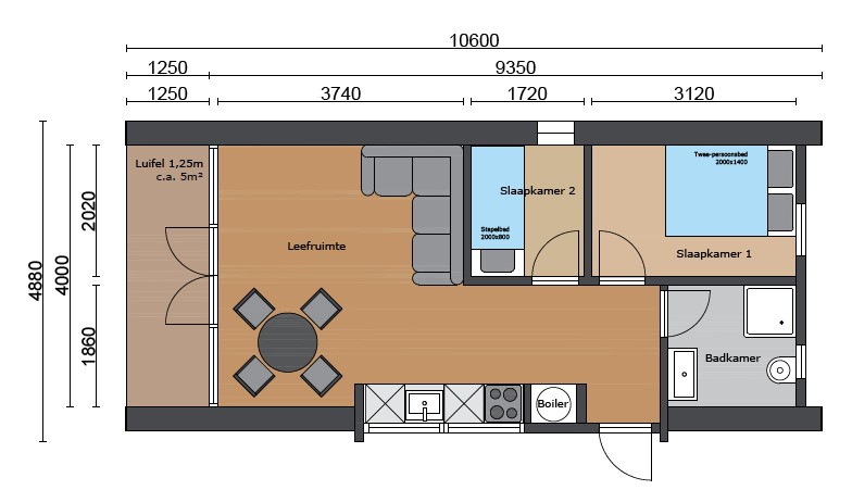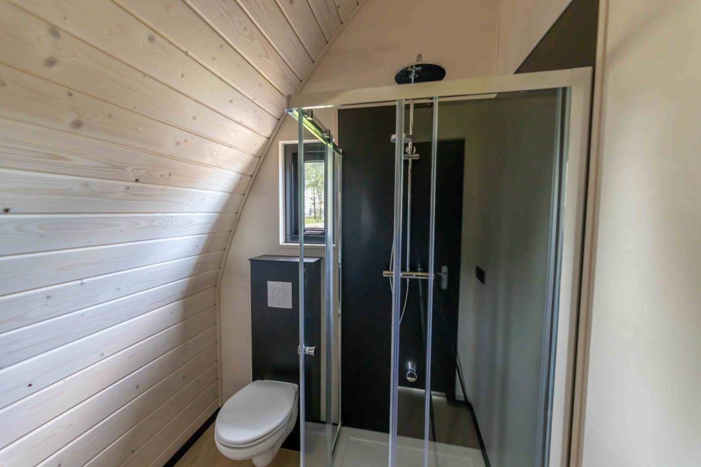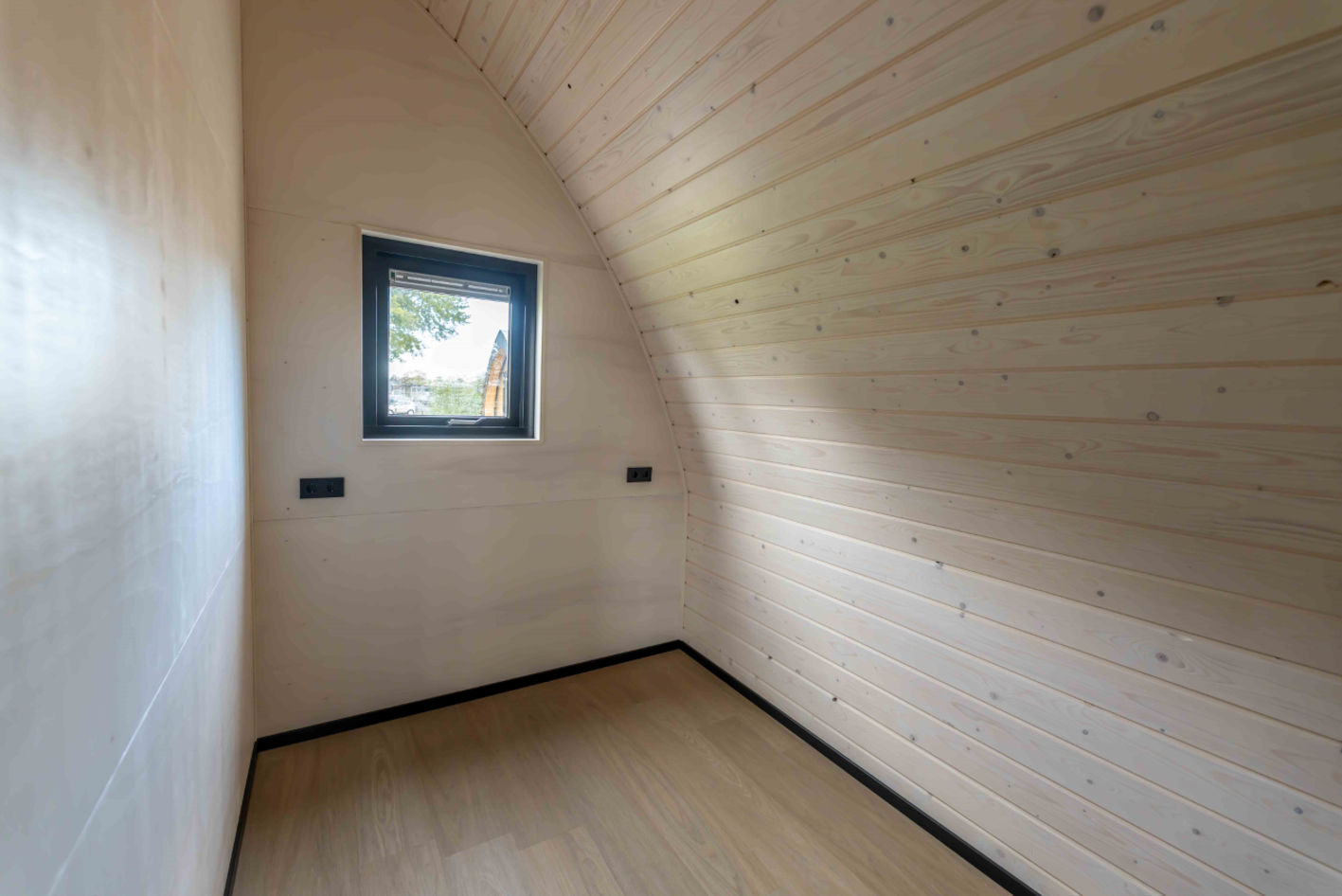 De pod bestaat uit vier ruimtes; het leefgedeelte met keuken, de badkamer, een 2-persoons slaapkamer en een slaapkamer met stapelbed. Naast de keuken is een extra toegangsdeur,